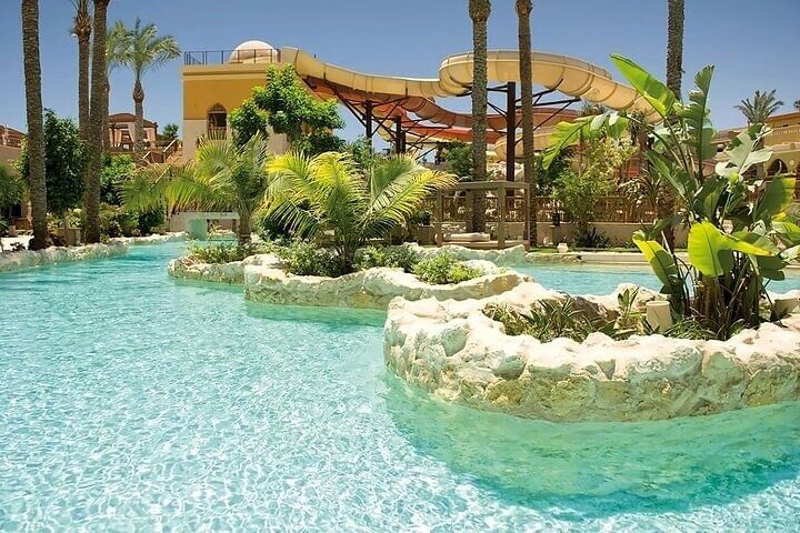The Makadi Water World Aqua Park features 38 water slides, 14 outdoor swimming pools, a heated pool, water lakes, poolside umbrellas, and sun beds. Hurghada’s largest water theme park is located just 25 minutes by car from the downtown area.